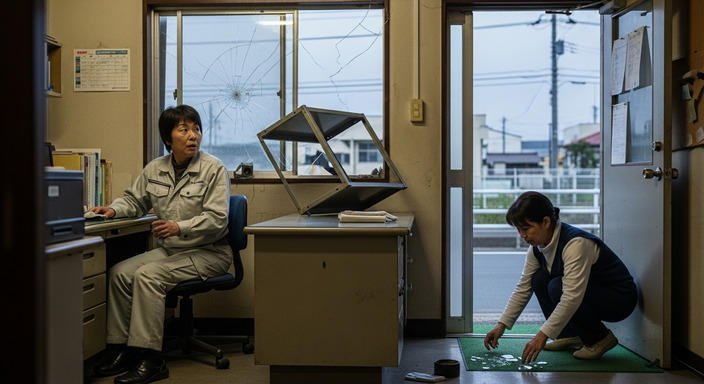 別のパート社員の机の上から、スチール棚が落ちている。 そして、窓ガラスが割れていた。きっと棚の上に置いてあった物が、