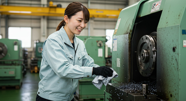 切り粉がたまってきているのを分かってはいたけれど、月初は自分の仕事も立て込み、 なかなか手が回らず…。そんな中、少し自分の仕事が落ち着いた日、「今日は掃除をしよう!」と 社員が立ち上がりました。 普段はデスクワークが中心の社員。それでも機械の周りを掃除していると、少しずつキレイになっていくのが嬉しくて、夢中に。油まみれになりながらも、「やっぱりキレイになるのは気持ちいい!」と満足そうな笑顔。