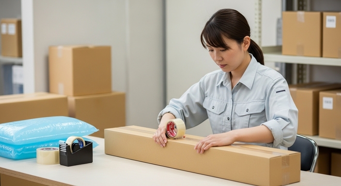 出荷の事前準備。今日出荷にならなくても、翌日には出荷する可能性がある。だからこそ、できることは先にやっておく。1200mm巾・1600mm長の緩衝材は、社員の背丈よりも長く、切るのもひと苦労。ダンボールも1500mmの長さがあり、組み立てだけでも一苦労。それでも「今日出荷するよ」と言われてからでは間に合わない。準備は仕事の半分。先を見据えて動ける社員の段取り力が光ります。